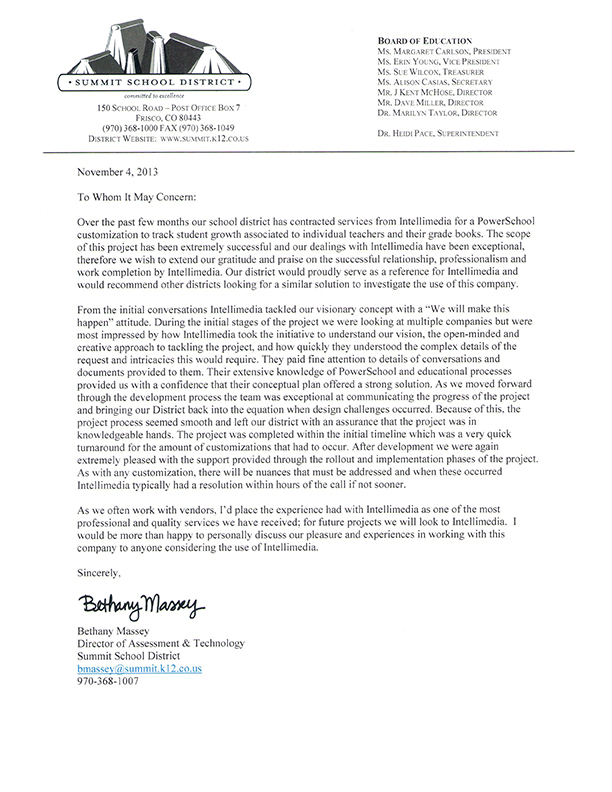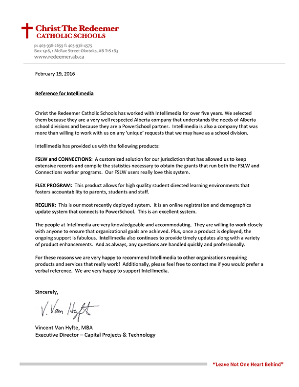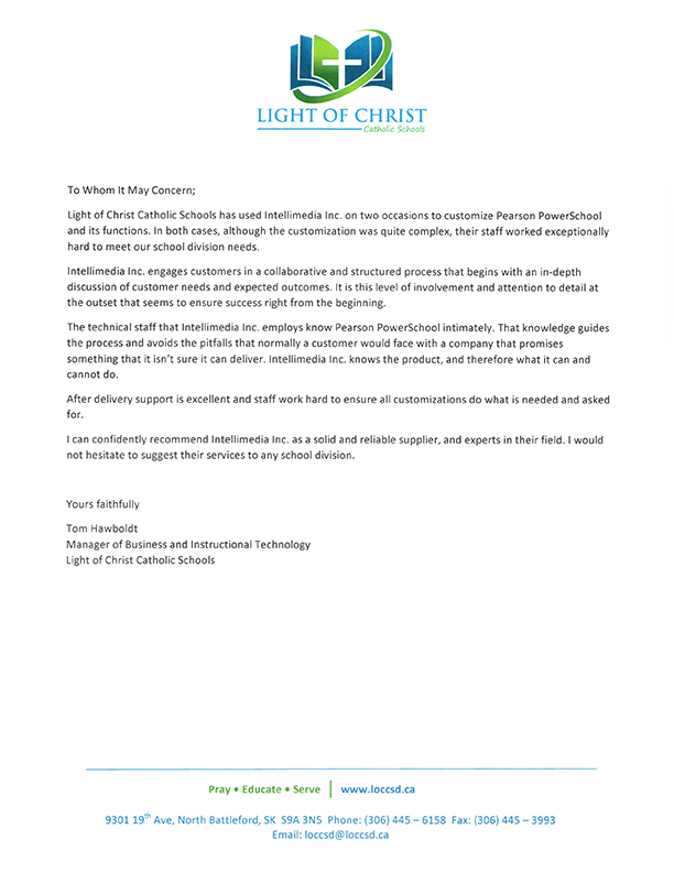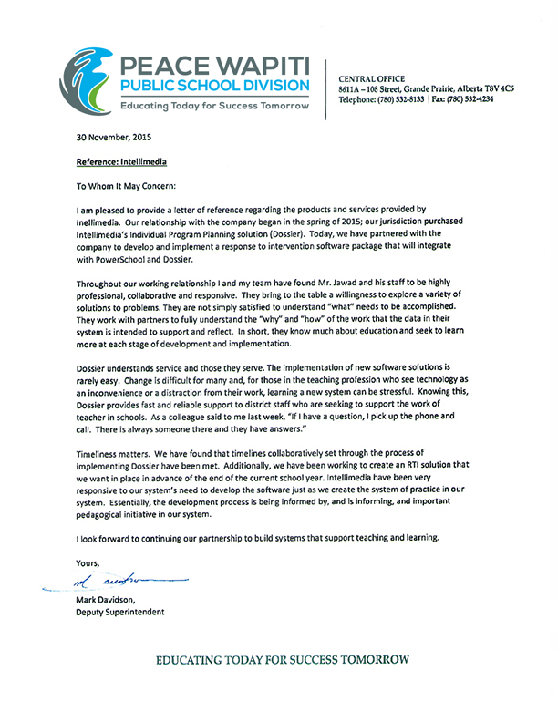 Intellimedia has been a valued partner of the Grande Prairie Public School Division for many years, and I greatly appreciate the relationships we have developed and the support we have received from the Intellimedia team to manage data and information in our division. As our use of Dossier and SchoolEngage have evolved over the years, one constant I especially appreciate has been the commitment of the Intellimedia team to remain focused and responsive on our needs to support continuous improvement in our data management processes. It is clear to me that Intellimedia truly understands our needs and is focused on providing valuable support to our staff.