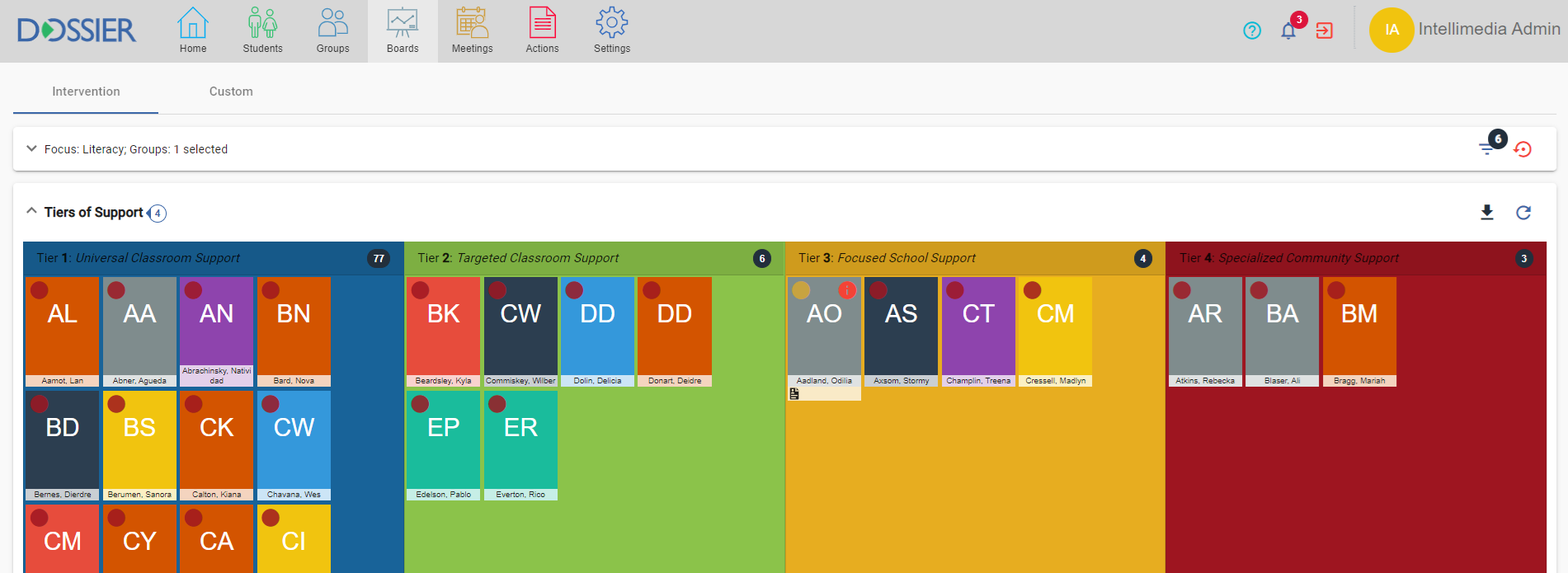 Visually organize and access students in team boards, indicating current levels of support needed in coordination with a school's collaborative response to intervention model.